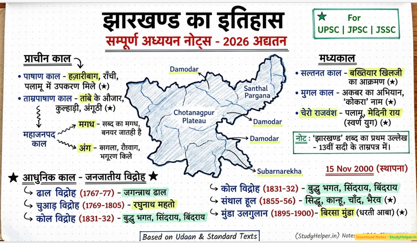 The notes are neatly handwritten, well-structured, and cover all major Jharkhand topics frequently asked in JPSC and Jh. state exams.